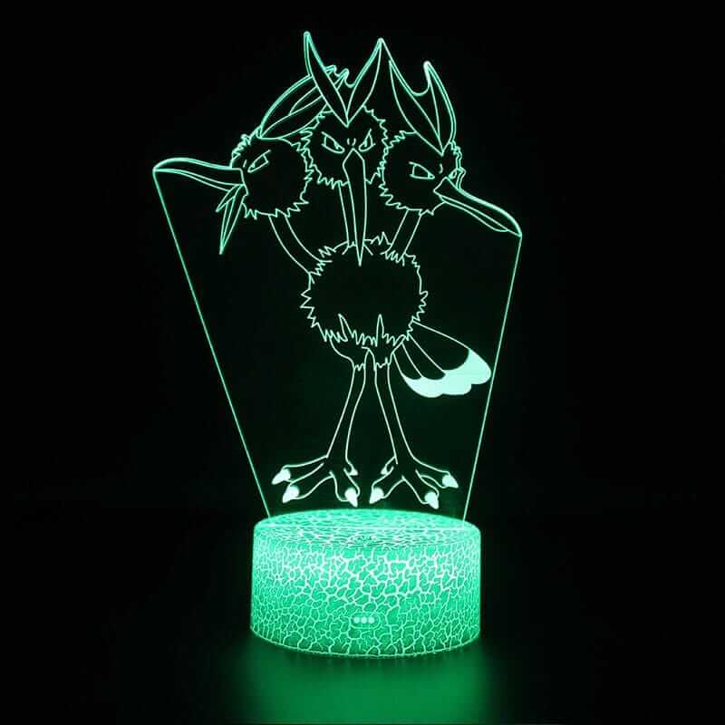 Deja que la Lámpara Dodrio de la Tienda Pokémon™ sea la nueva centinela luminosa de tu espacio. Esta lámpara representa al imponente Dodrio, conocido por su formidable presencia y velocidad relámpago en el mundo de Pokémon. Con tres veces el carisma y la personalidad, esta lámpara no solo es una pieza decorativa llamativa, sino también una ingeniosa fuente de luz. Emitiendo un resplandor verde tranquilo, es perfecta para aquellos momentos de concentración antes de una gran batalla Pokémon o como luz de ambiente relajante para tu guarida de entrenador.